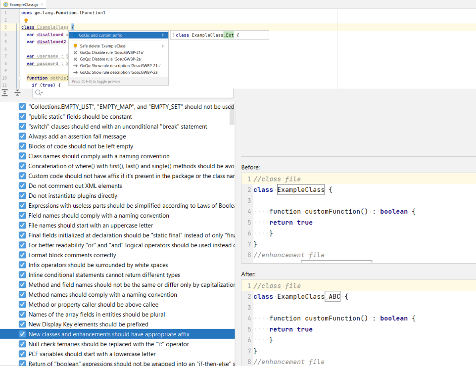 Fixing coding issues becomes a breeze with GoQu's intelligent assistance right where you need it. GoQu offers Guidewire-specific guidance on how to address each issue, explaining why it's problematic in the Guidewire context, and detailing associated risks. With comprehensive rule descriptions and Guidewire-centric code examples, you'll gain deeper insights into best practices. Plus, GoQu's QuickFix feature provides one-click solutions for swift issue resolution, tailored to Guidewire's unique requirements.